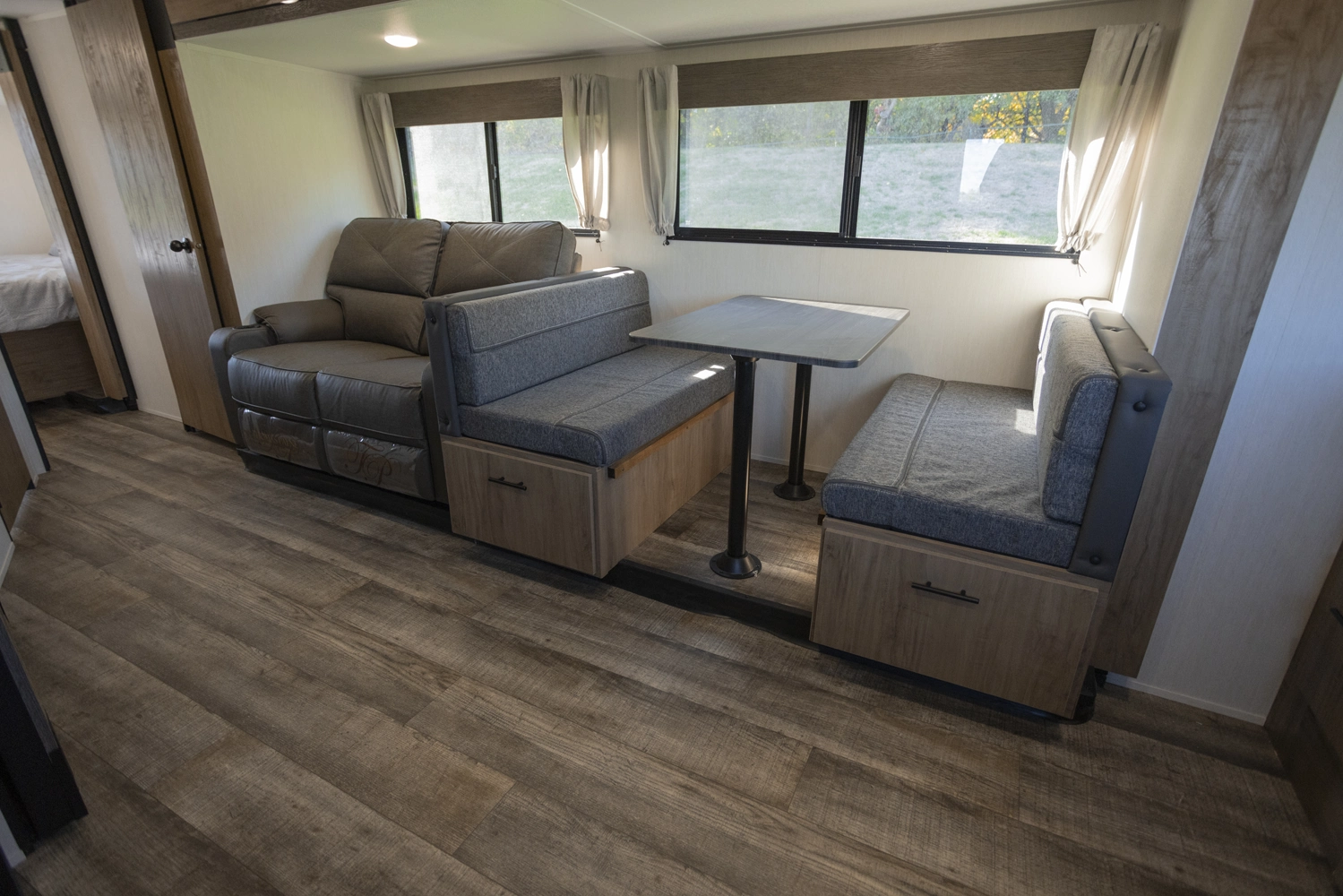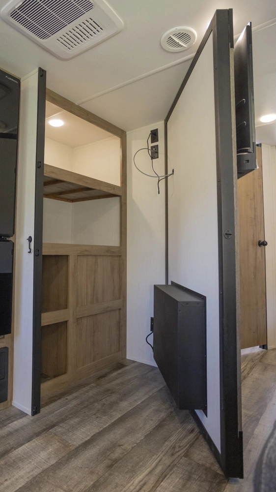 The Campsite Ultra 26BW a front kitchen floorplan that will thrill the cook among your crew with the natural light alone. Yes, those rear windows keep everything open and bright, and the hidden pantry behind the entertainment center reaffirms the fact that this front kitchen has everything your camp chef needs to store goods and prep delicious camping meals.