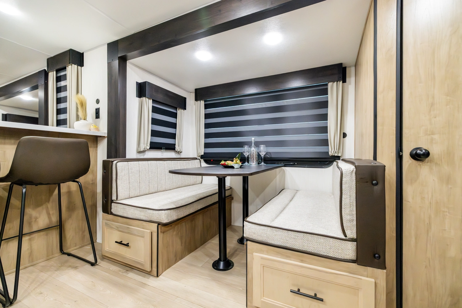 The triple slide is the perfect unit for affordable luxury and livability. The rear entertainment living room is surrounded by panoramic windows as well as two sofa slide and two recliners. The chef’s kitchen, kitchen bar with stools, and dinette slide with slide out drawers and full door pantry offer meet the needs of any chef. The private master suite completes the interior. Outside enjoy the Cherokee camp kitchen, outside entertainment speakers, and TV bracket under our power awning.