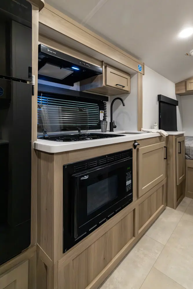 The E-Pro 19RL brings big comfort to a compact trailer. It’s the first E-Pro with theater seating, giving you a more relaxed and residential feel inside a lightweight camper. The smart rear living layout, efficient kitchen, and versatile sleeping space make it perfect for couples who want easy towing without sacrificing comfort or modern features on the road.