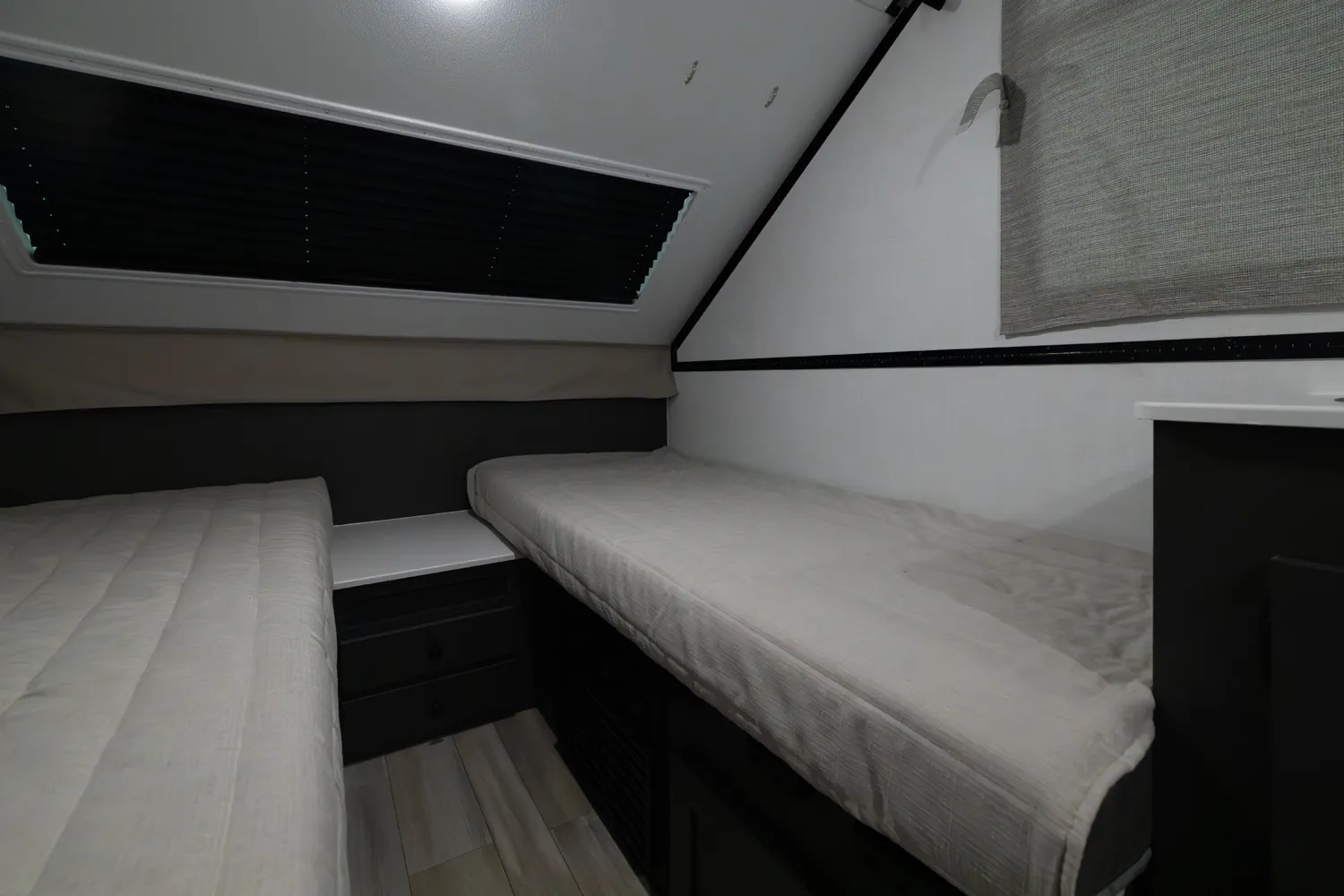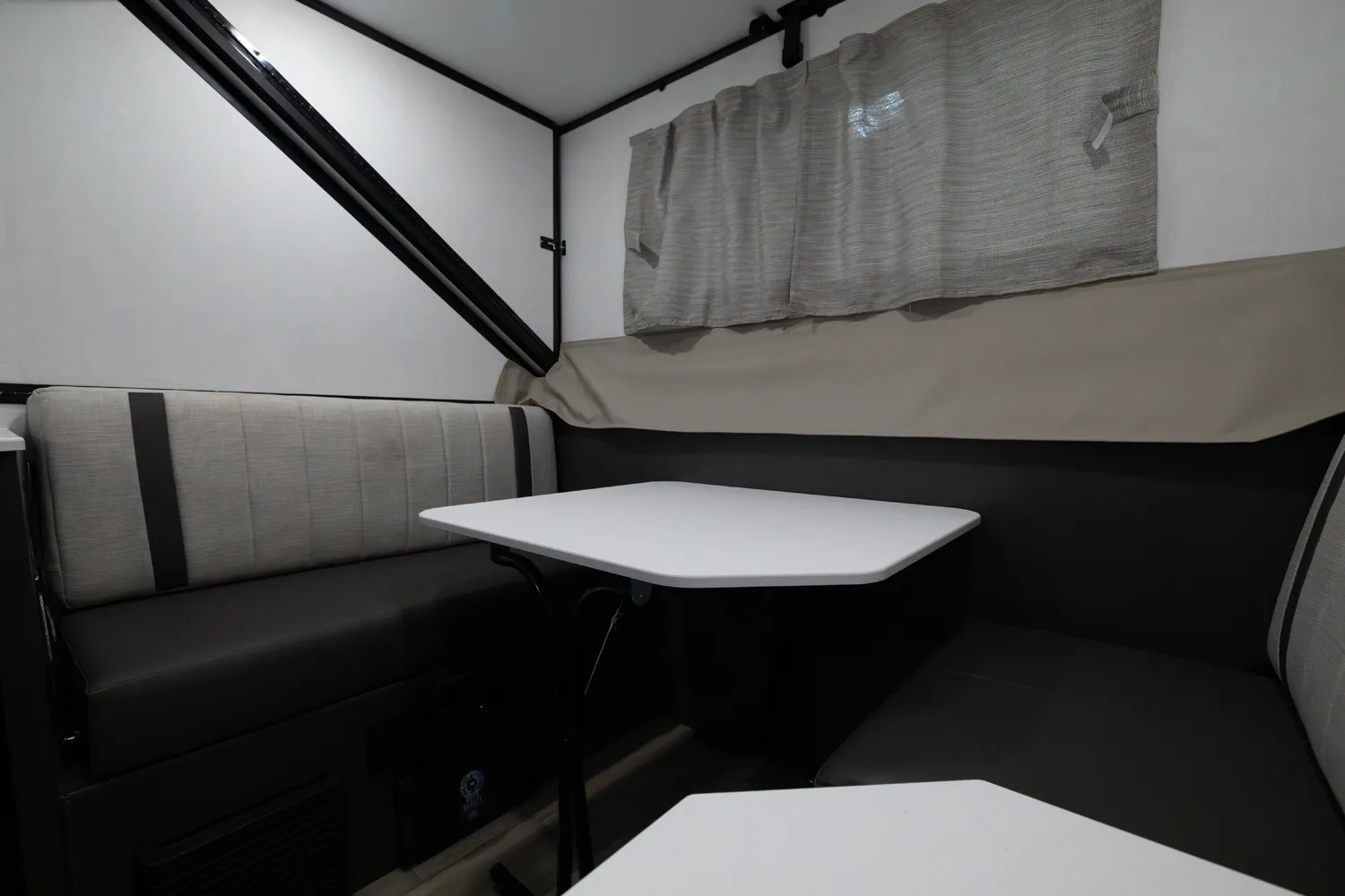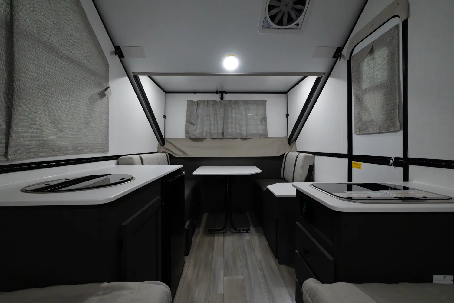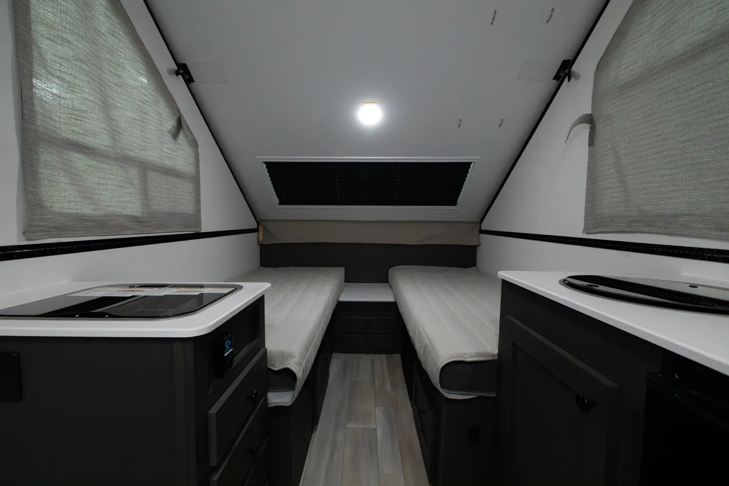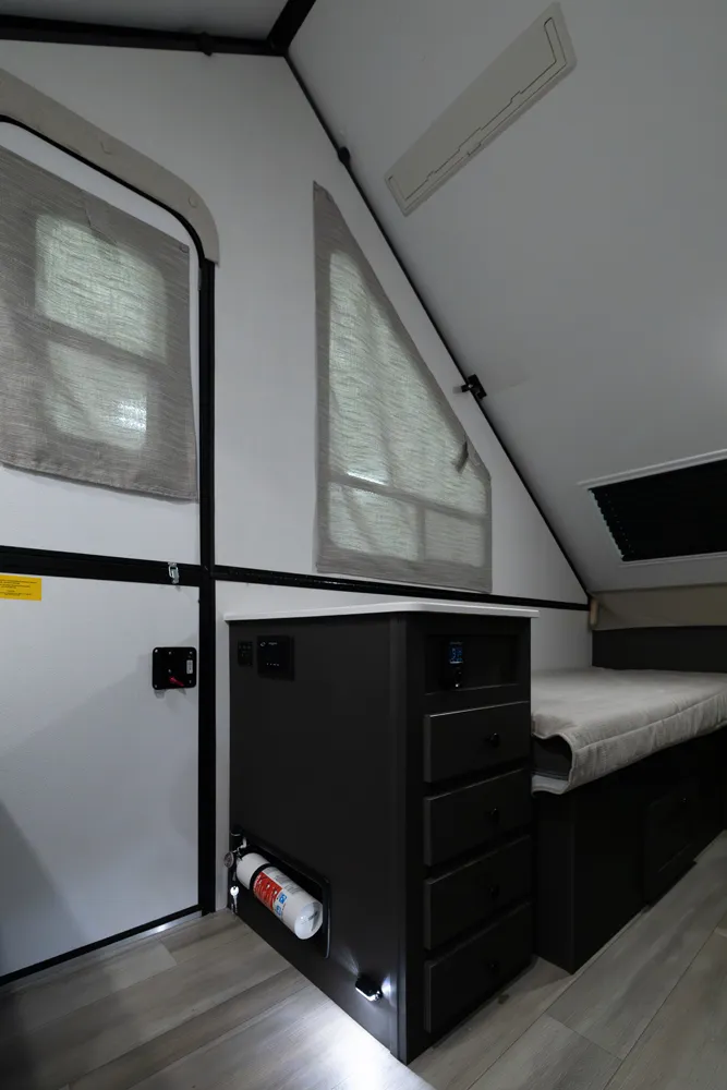 The Flagstaff Hard Side T21HS delivers smart comfort in a compact design. A front dormer provides increased head height above the front dinette, which easily converts to sleeping space. Inside you’ll find a convenient wet bath, cooktop, and sink, while the rear features twin bed platforms with a king bed insert option. An easy-reach front storage trunk adds extra convenience for gear on every adventure.