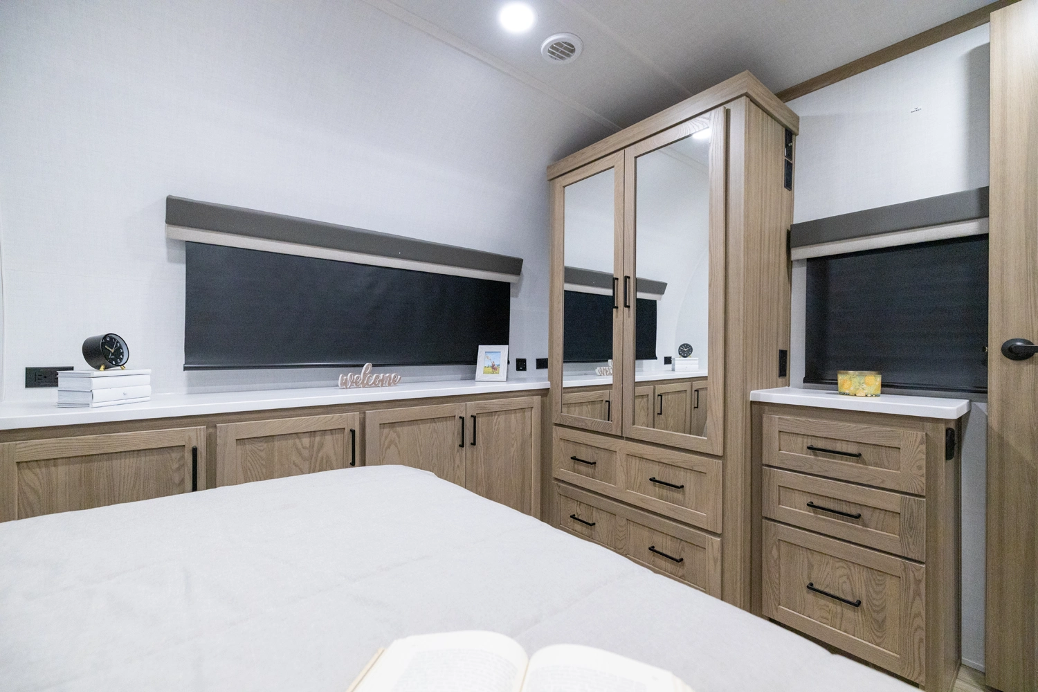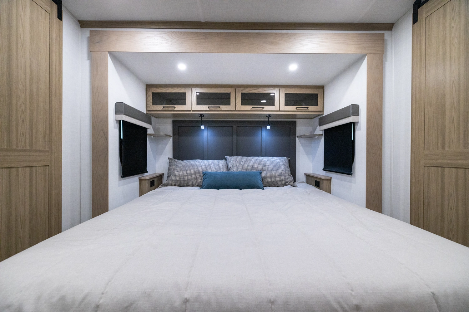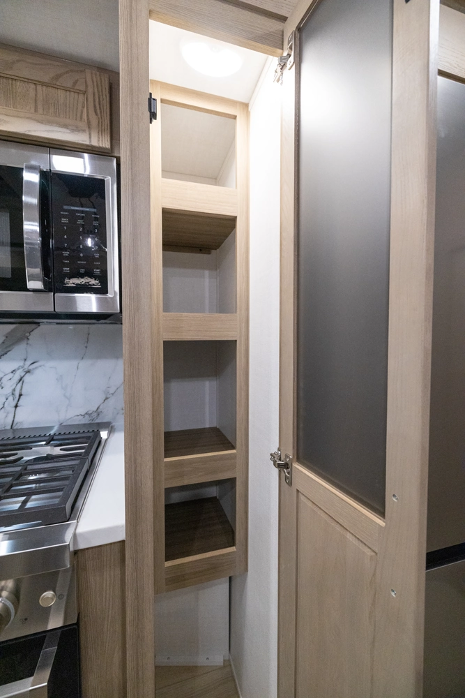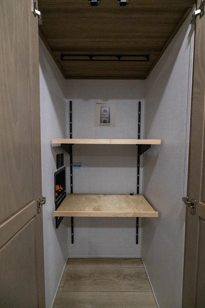 This spacious dual bedroom floorplan features a rear king suite with a full bath and a front queen bedroom with its own bath as well. Between them is a large open living area with a U-shaped dinette, theater seating, fireplace and well-equipped kitchen with an island. 4 slide outs widen the space, maximizing comfort and storage for families or couples.