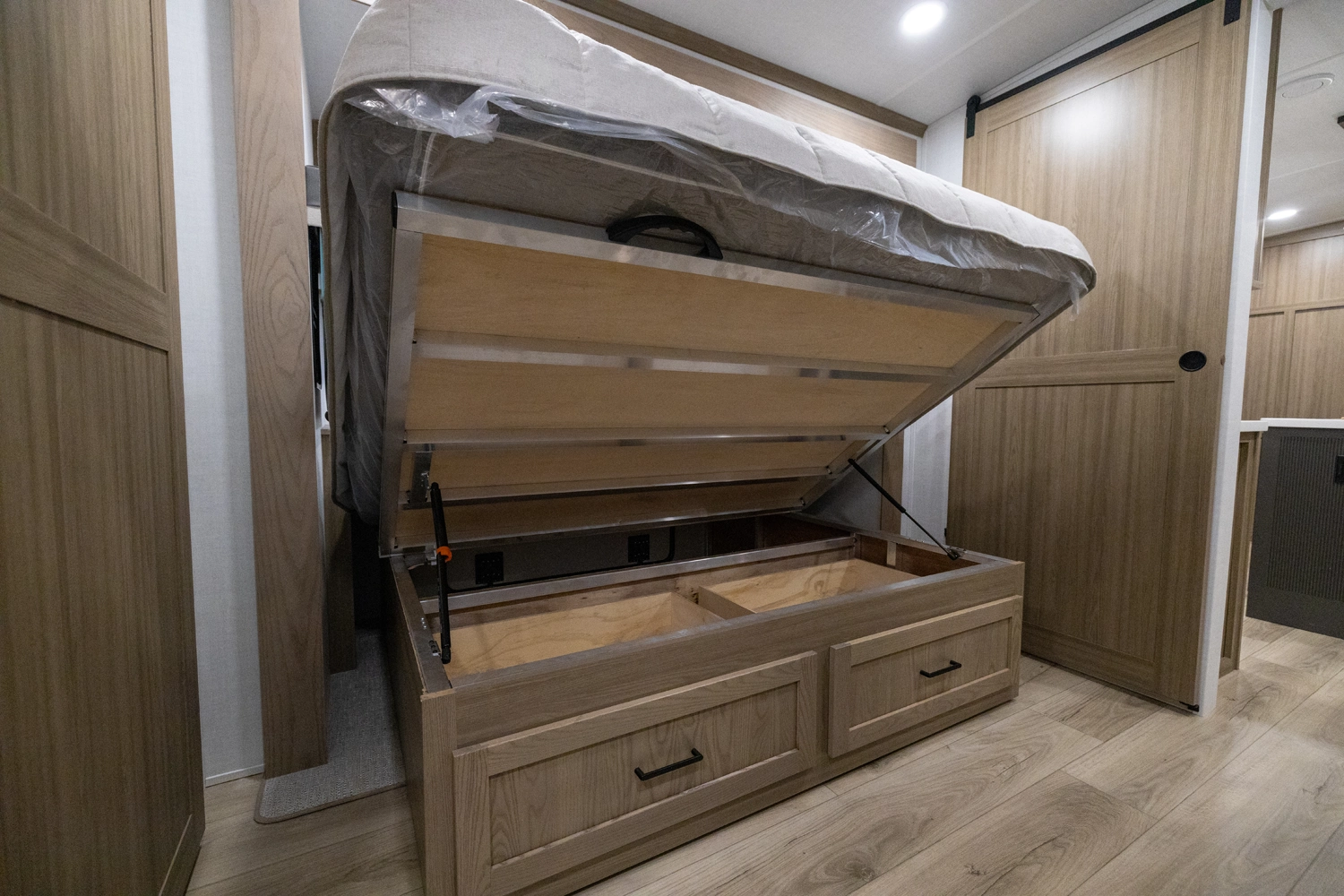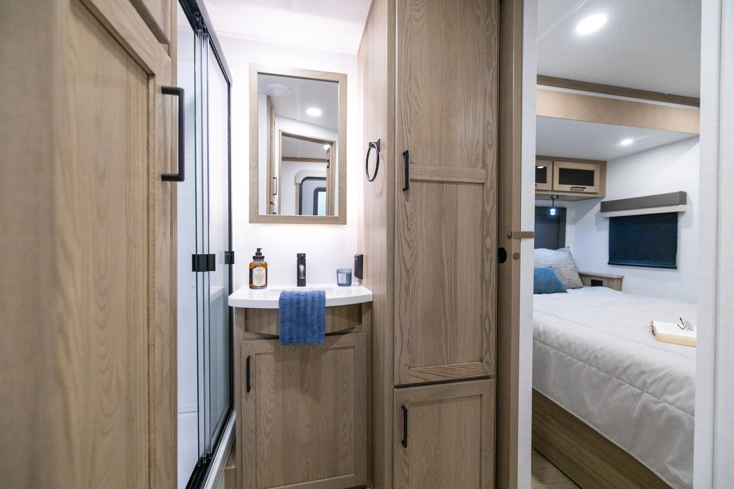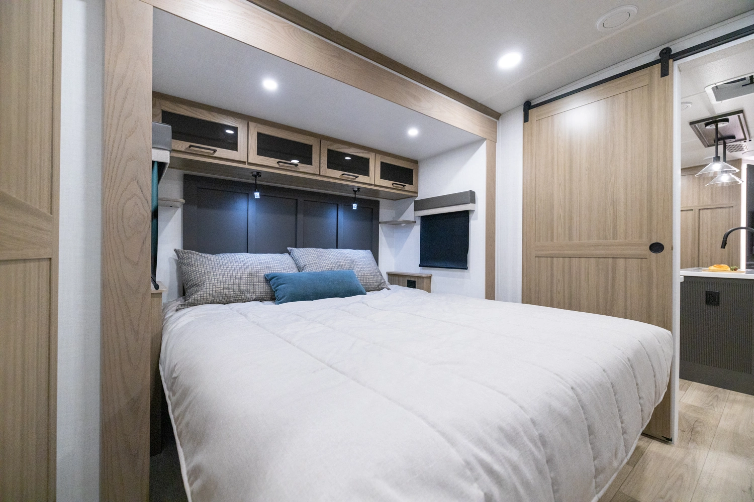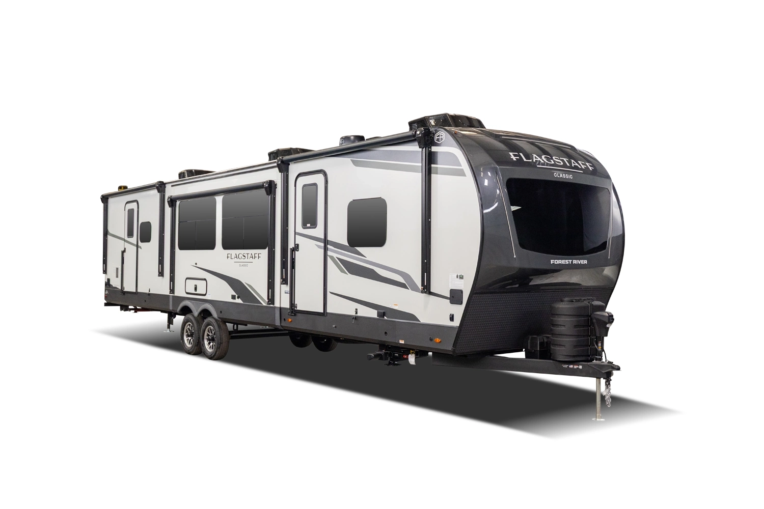 This spacious dual bedroom floorplan features a rear king suite with a full bath and a front queen bedroom with its own bath as well. Between them is a large open living area with a U-shaped dinette, theater seating, fireplace and well-equipped kitchen with an island. 4 slide outs widen the space, maximizing comfort and storage for families or couples.