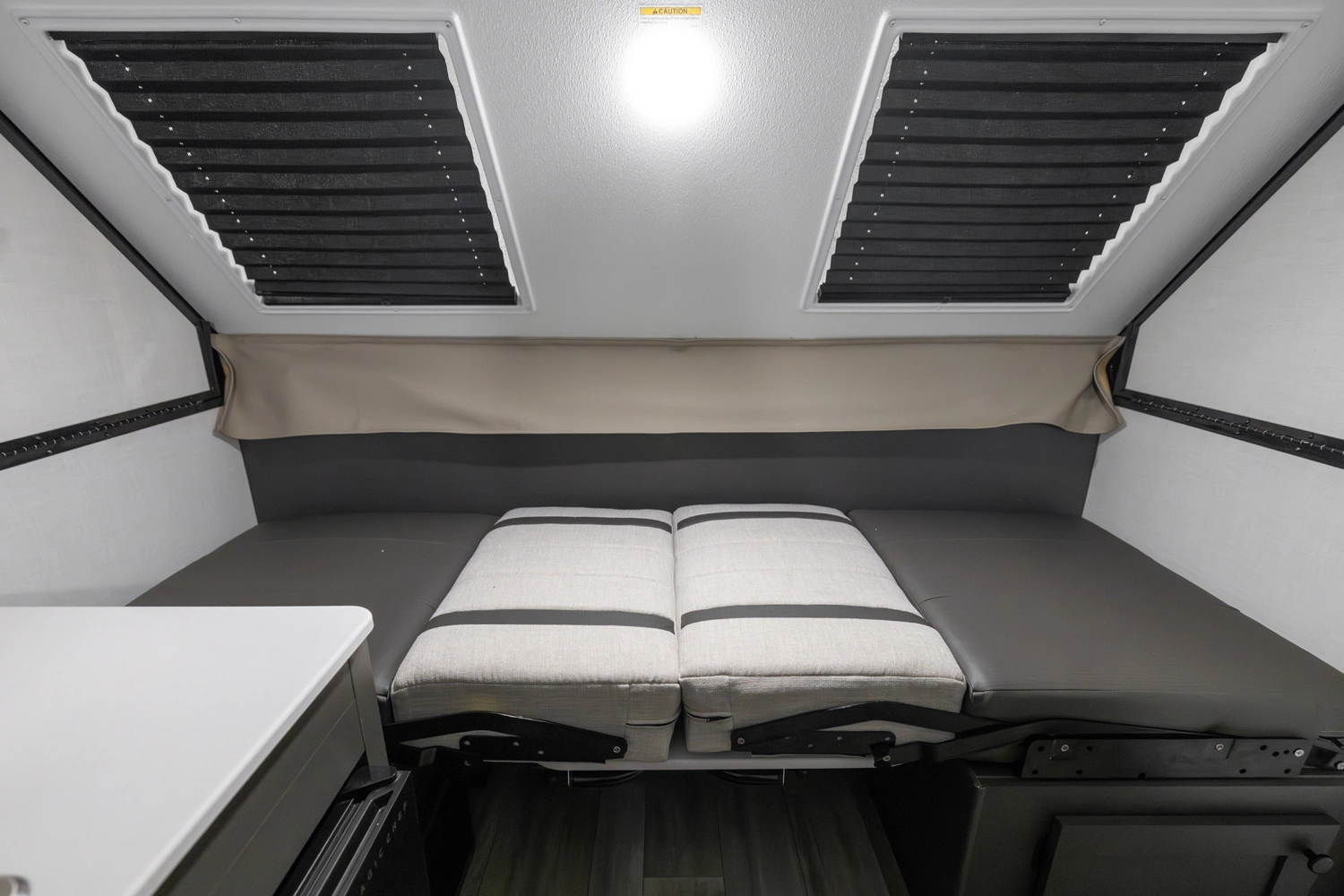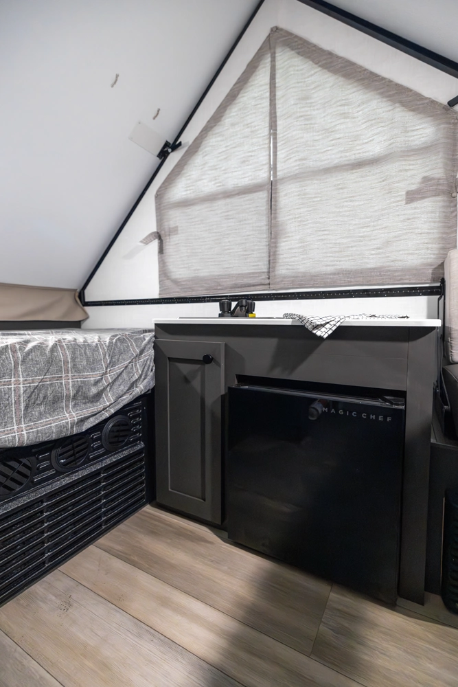 The Flagstaff T10RB is a traditional A-frame that blends simplicity with smart design. It features a front 33" x 80" dinette and a rear 54" x 80" bed that flips up for easy access. Inside, you'll have a convenient fridge, and outside, EZ-reach storage trunk and a griddle for cooking up meals wherever you go.