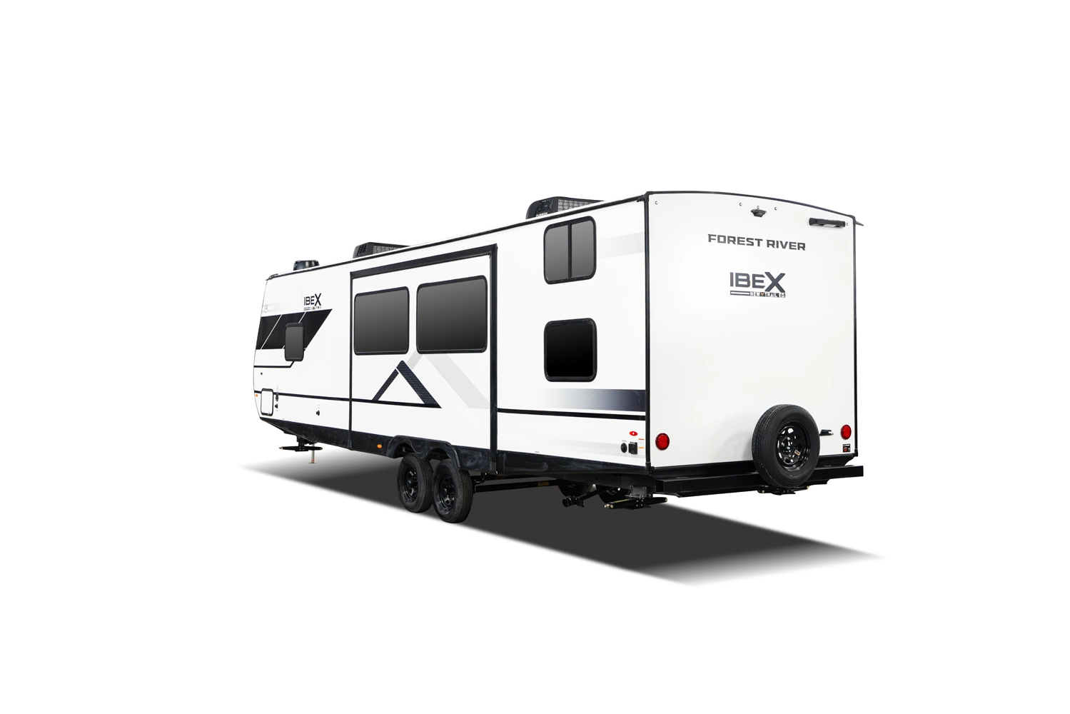 The Ibex New Trail Edition TRAIL28 features a front queen bed, central living area with sofa and dinette, a full kitchen, and a walk-through bath. A private rear bunk room offers four bunks and extra storage. Includes washer/dryer prep, tankless water heater, 50-amp service, and designed with superior construction.