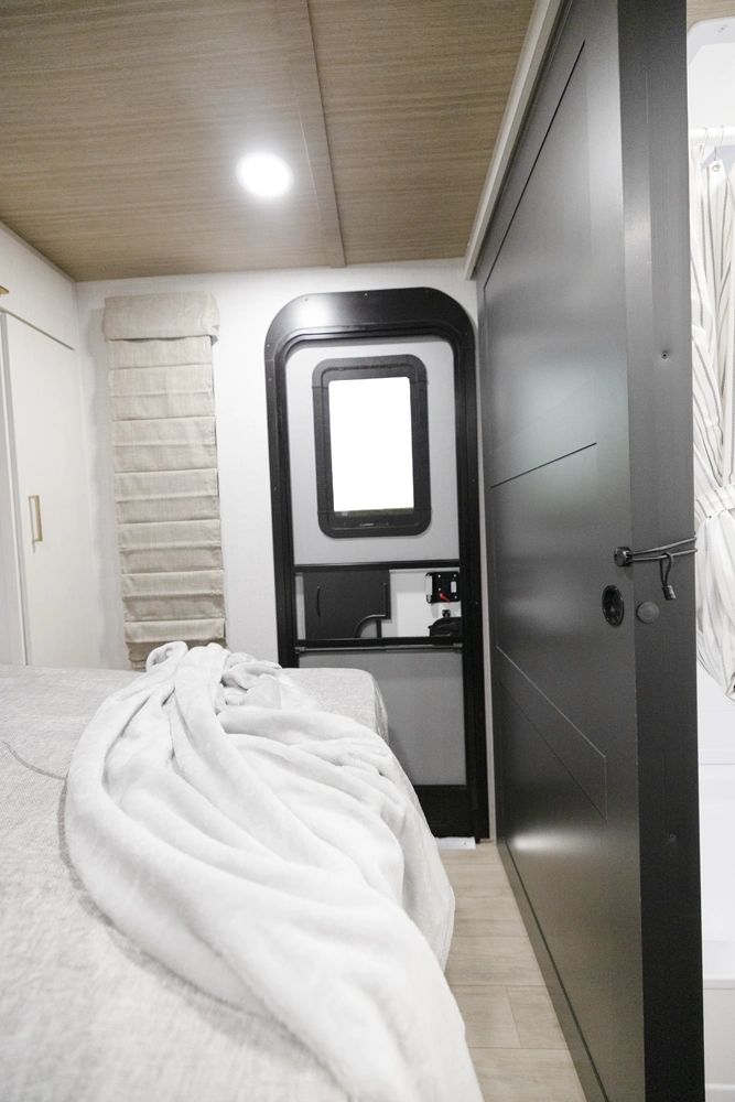 The 2400RB is great for couples who enjoy scenic views from the comfort of their living space. With almost a full panoramic view in part to our European-Style square windows, there is no shortage of natural light with a spacious open feel. The 2400RB comes packed with already added features such as 2 A/Cs, a king bed, porcelain toilet and much more!
