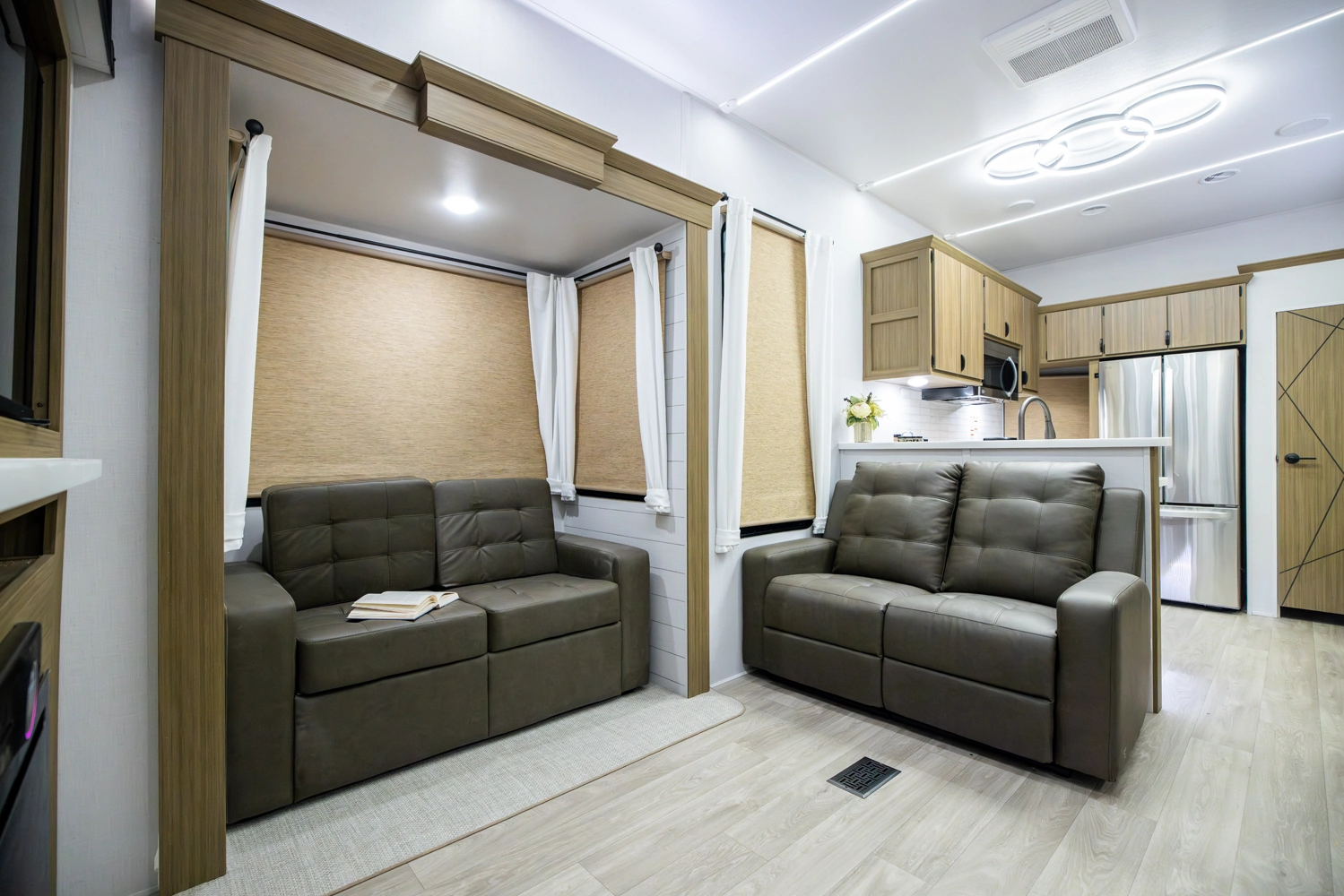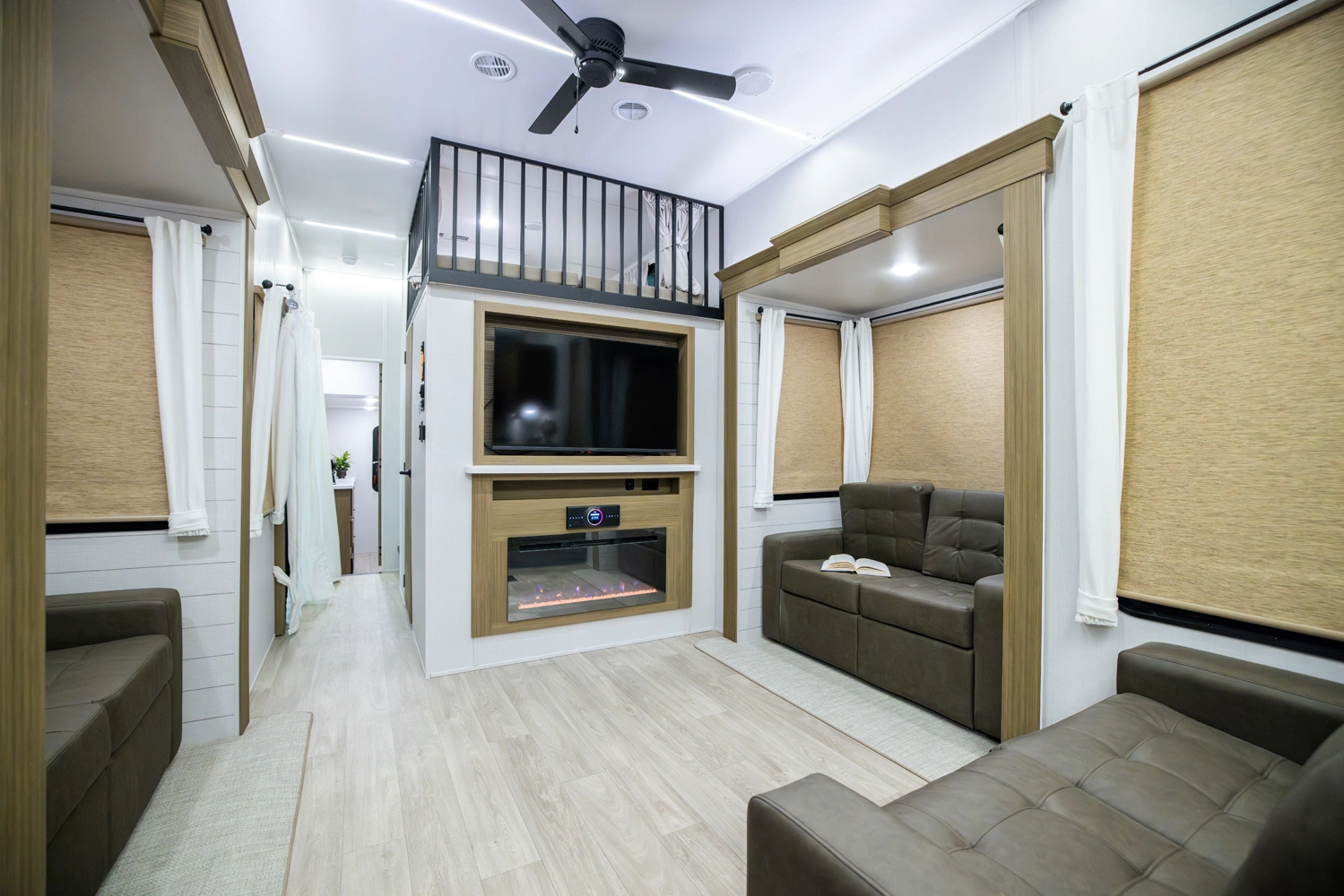 The Wildwood Grand Lodge 42FK is a truly exceptional destination trailer. The large front kitchen is equipped with residential appliances, tons of cabinet and pantry space, and a free-standing dinette. The large living area provides two sofas and an entertainment center with TV and fireplace, while the large rear master bedroom offers a full wardrobe and dresser. The HUGE walk-up loft is perfect for friends and family, with four separate bunks and plenty of space to stretch out.